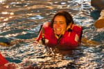 Après être sorti de l’eau Maunoir a percuté le radeau de survie (périmé depuis longtemps) qui s’est gonflé sans problème. Mais lorsque je suis monté dedans le collage du fond n’a pas résisté. D’un bip huit places, nous avions une grande bouée couverte d’une tente. Cela ne nous a pas empêché de nous tester à monter dedans et d’en apprécier la difficulté en étant dans l’eau.