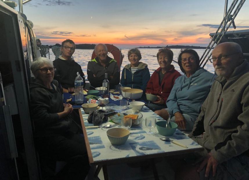 Nous terminons cette journée par… un apéro suivi d’un délicieux 😋 risotto aux légumes préparé par Jacques et Lina, tout cela servi dans le cockpit, sous le regard d’un merveilleux soleil couchant…magnifique soirée finissant au son de quelques chansons d’antan…