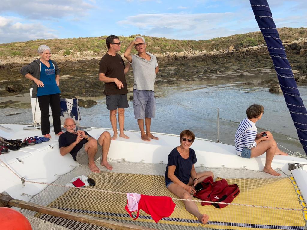 Embarqués aux Bas Sablons, nous avons pris la direction de Chausey sous une pluie fine et sans vent ! Cependant au fil de la matinée, le ciel s’est dégagé, un souffle de vent l’accompagnant, notre traversée s’est terminée sous voile et le soleil nous accueille en arrivant à Port Homard, superbe mouillage. Et hop, comme c’est la marée haute : baignade autour du bateau.