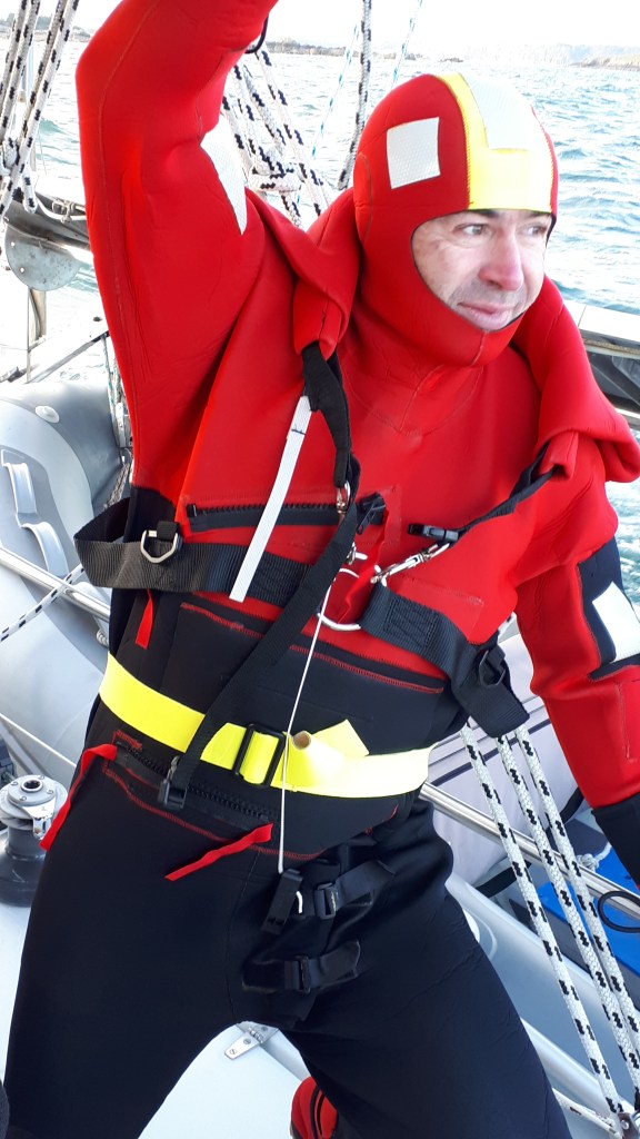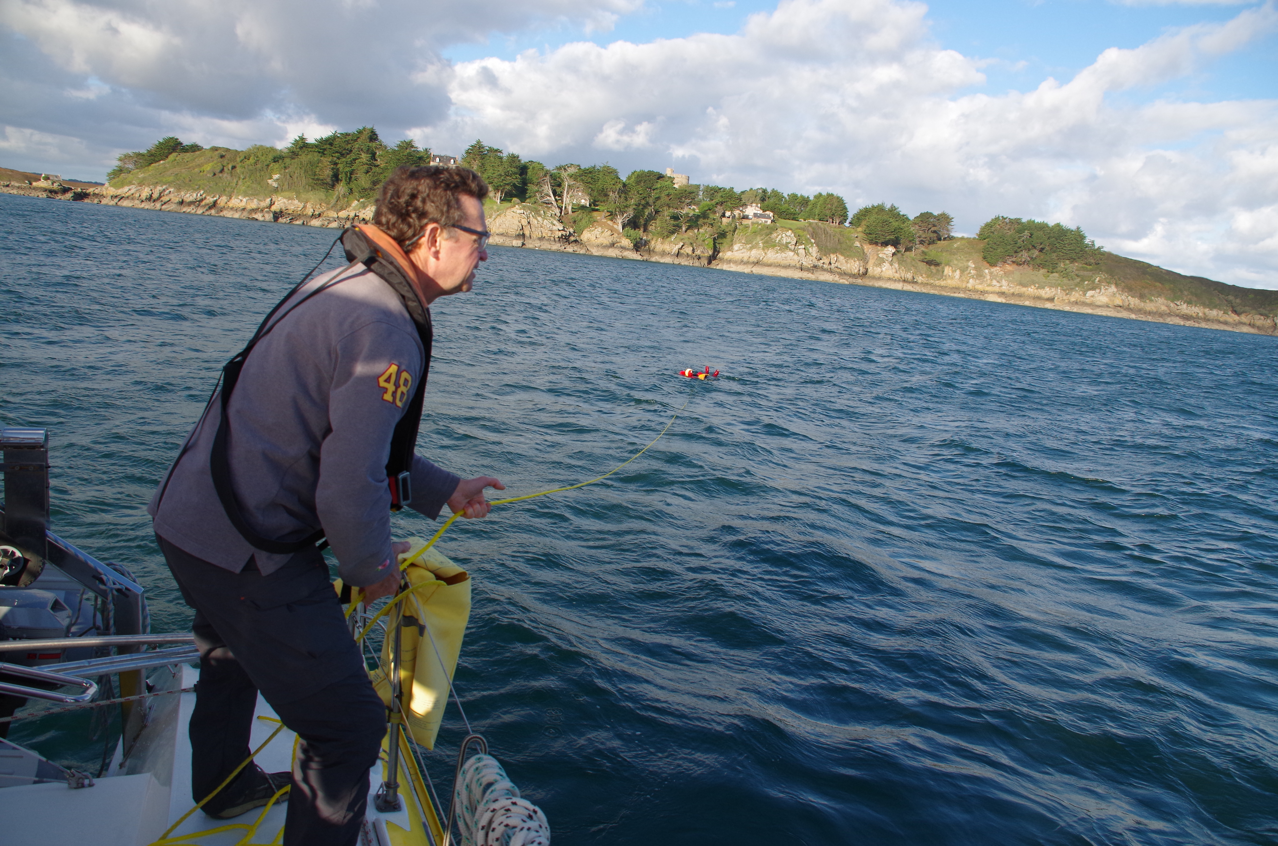 En arrivant sur site, la vedette de la station de St Cast et un semi-rigide nous dépassent. Ils sont donc sur zone lorsque Big-Bang (les autres bateaux sont également sur zone) passe au point de rendez-vous. Des échanges ont lieu sur VHF et le signal est donné. Philippe, en combinaison de survie se jette à l’eau puis est récupéré à l’aide de la ligne prévue à cet effet et mise à disposition sur chaque bateau de l’association. Le matériel pourtant jamais utilisé est défectueux. La couture du harnais lâche lorsque Philippe veut l’enfiler. Un scandale pour du matériel de sécurité. La couture a en fait été faite trop sur le bord du tissu !!!