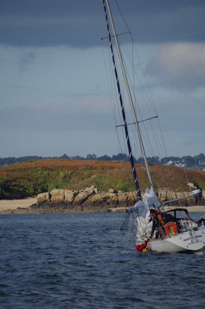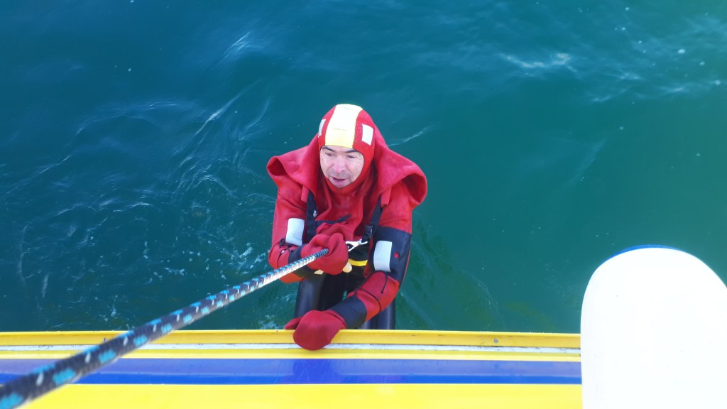 Le dimanche nous avons réitéré les récupérations d’homme à la mer mais cette fois le bateau était sous voiles lorsque Alain a sauté à l’eau. Donc un cran de plus, et tout s’est bien passé.