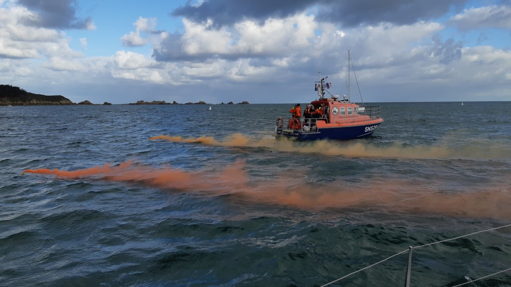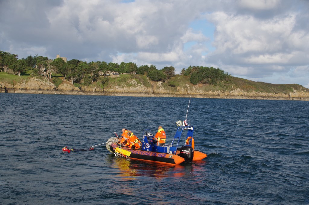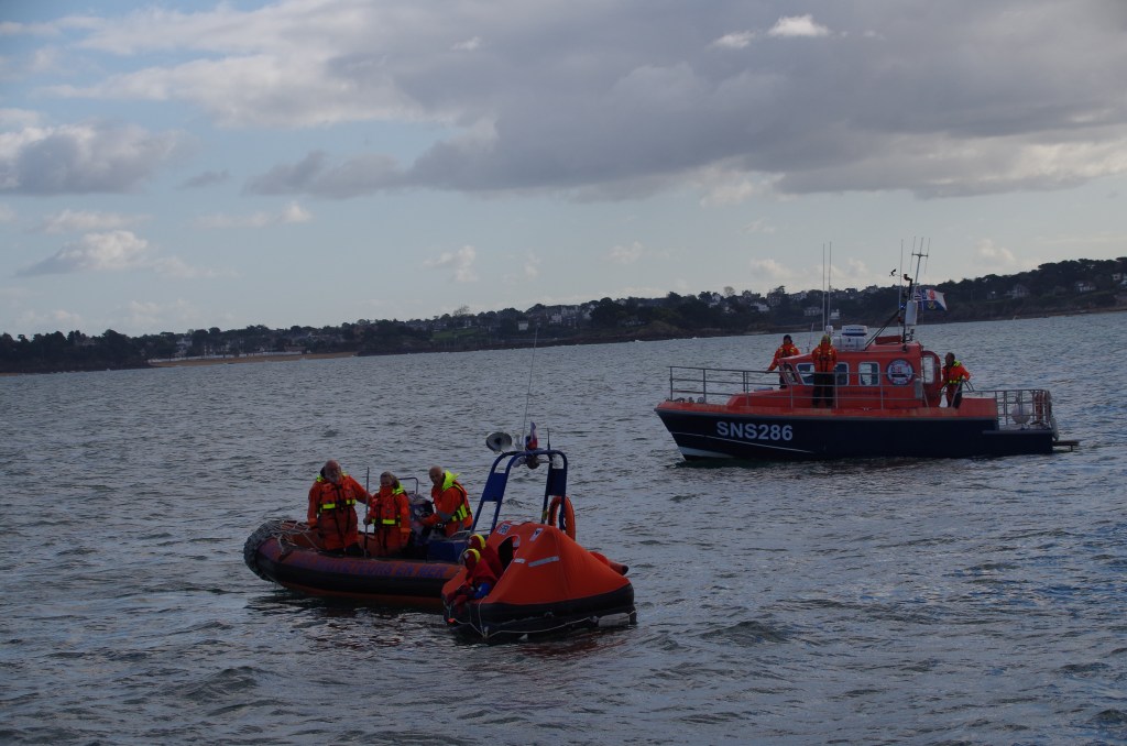 Nous répéterons l’exercice plusieurs fois avec une récupération différente à chaque fois. Drisse de spi, palan de grand voile, dans un pneumatique par les sauveteurs ainsi que sur leur vedette. A noter que la vedette de Lancieux nous a rejoint, preuve de l’intérêt qu’ils portent à notre action.