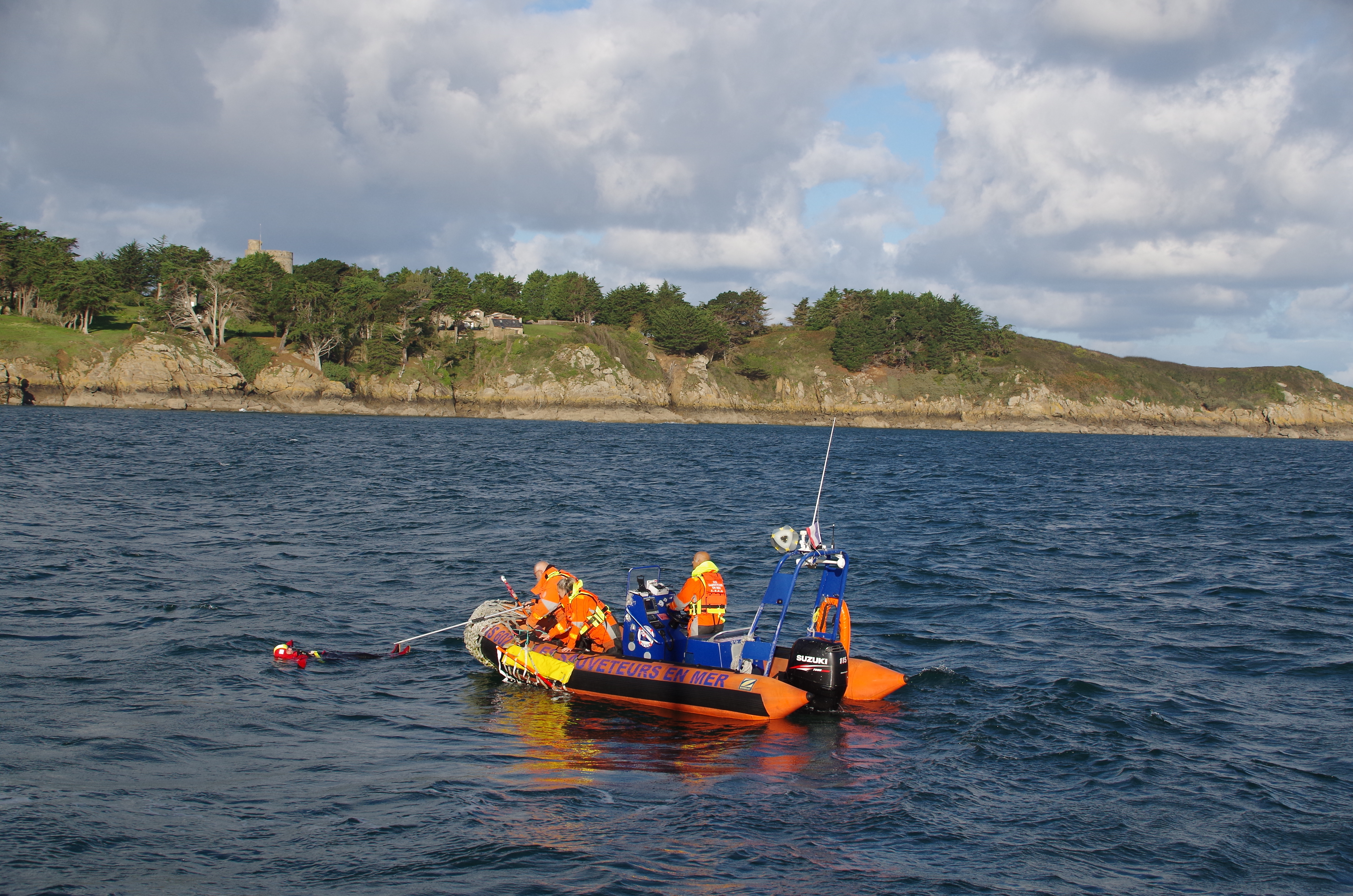L’association des plaisanciers de St Cast, à la demande des sauveteurs se joint à nous afin de profiter des mises en situation. En fait un seul bateau (voilier) de l’APSC se rendra sur site, une vedette de huit mètres trouvant la mer trop agitée ne suivra pas. C’est bien de connaître ses limites.