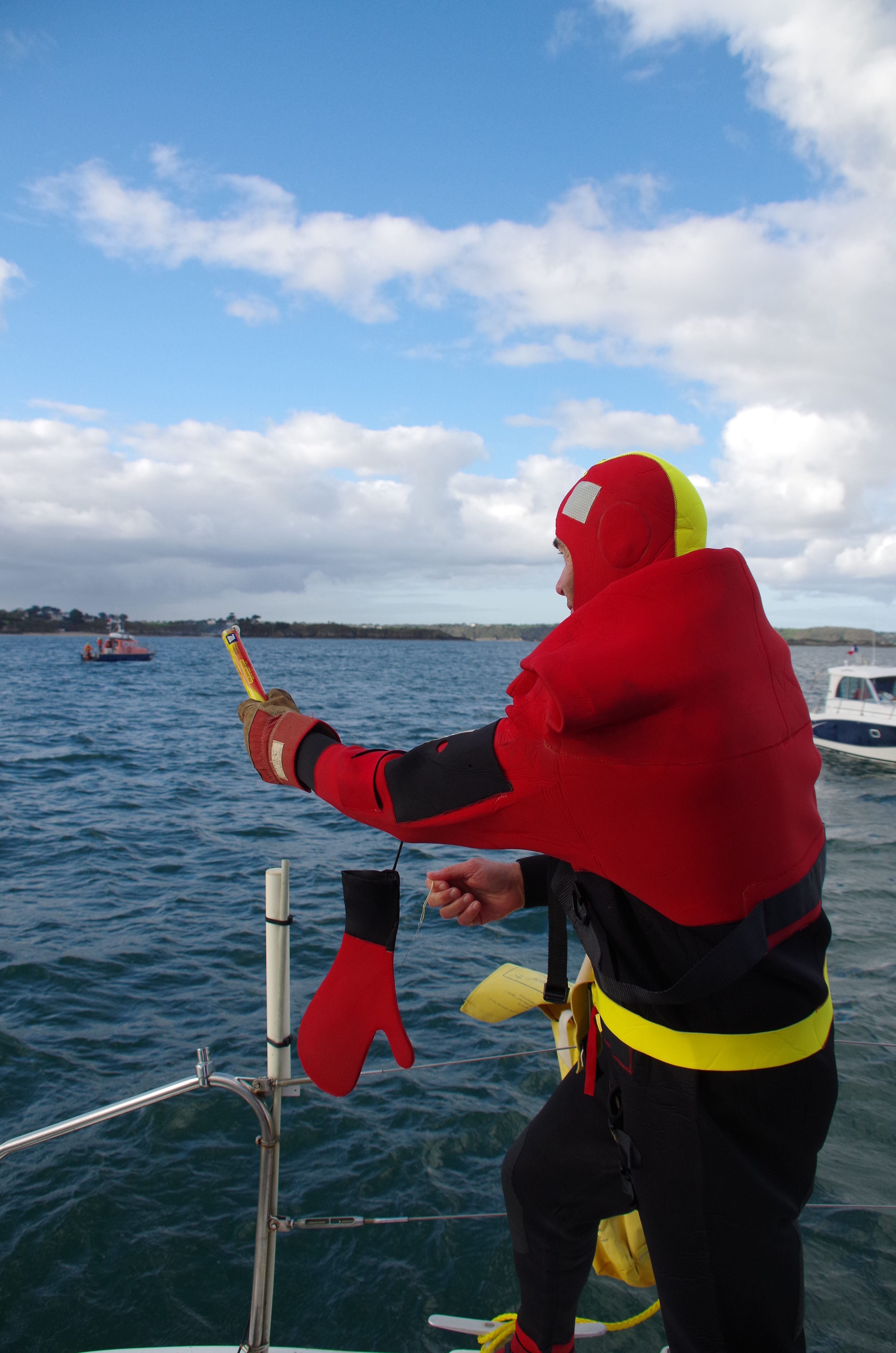 Port des gants indispensable, pourtant il n’y en a pas dans les radeaux de survie. Brûlure garantie ! Tous les feux à main n’ont pas fonctionné, et en particulier ceux qui sont périmés depuis peu !!! Deux sur une pochette de trois sur Big-Bang et trois sur la vedette de St Cast.