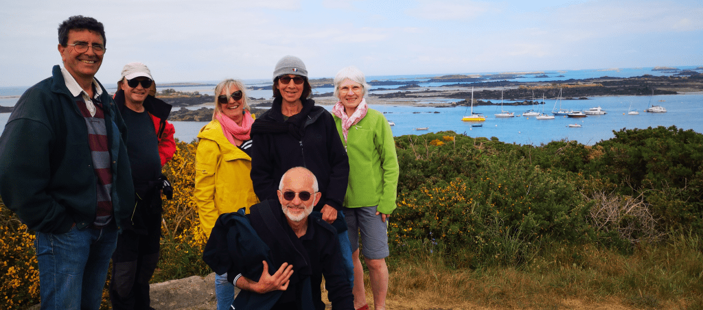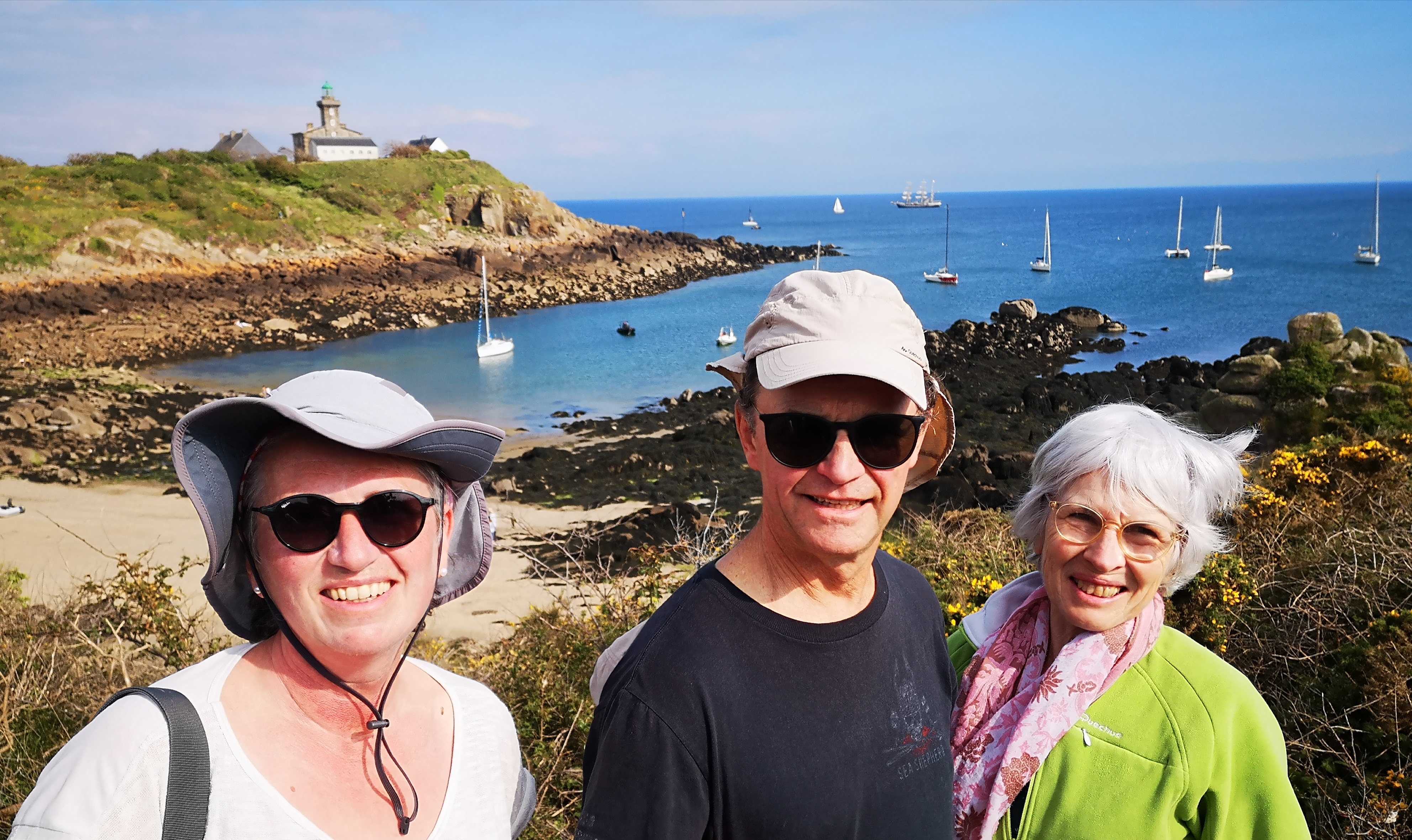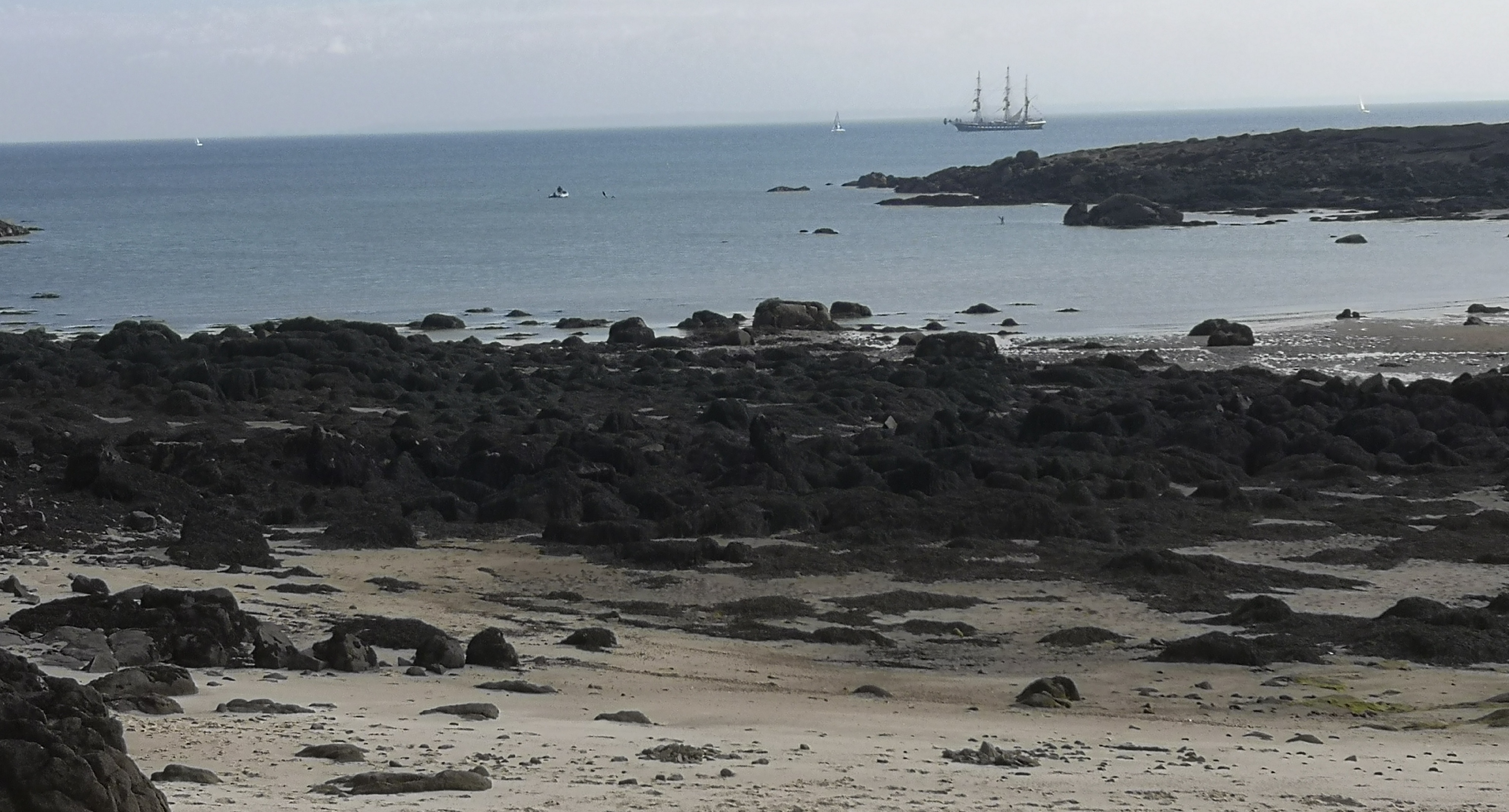Arrivés en vue des îles normandes, le temps s’est largement dégagé. Nous dépassons même Jusica ( Jean-Pierre, Isabelle, Véronique et François) sous le regard de 2 fous de bassan et la bisquine « la Cancalaise ». Nous nous rejoignons dans le Sound, puis nous décidons de randonner sur la grande île ( il y a bien un Cromlec’h : le Cromlec’h de l’oeillet au Nord ). Au sémaphore, nous apercevons le « Bélem » qui contourne l’île. Nous le suivons jusqu’au phare.