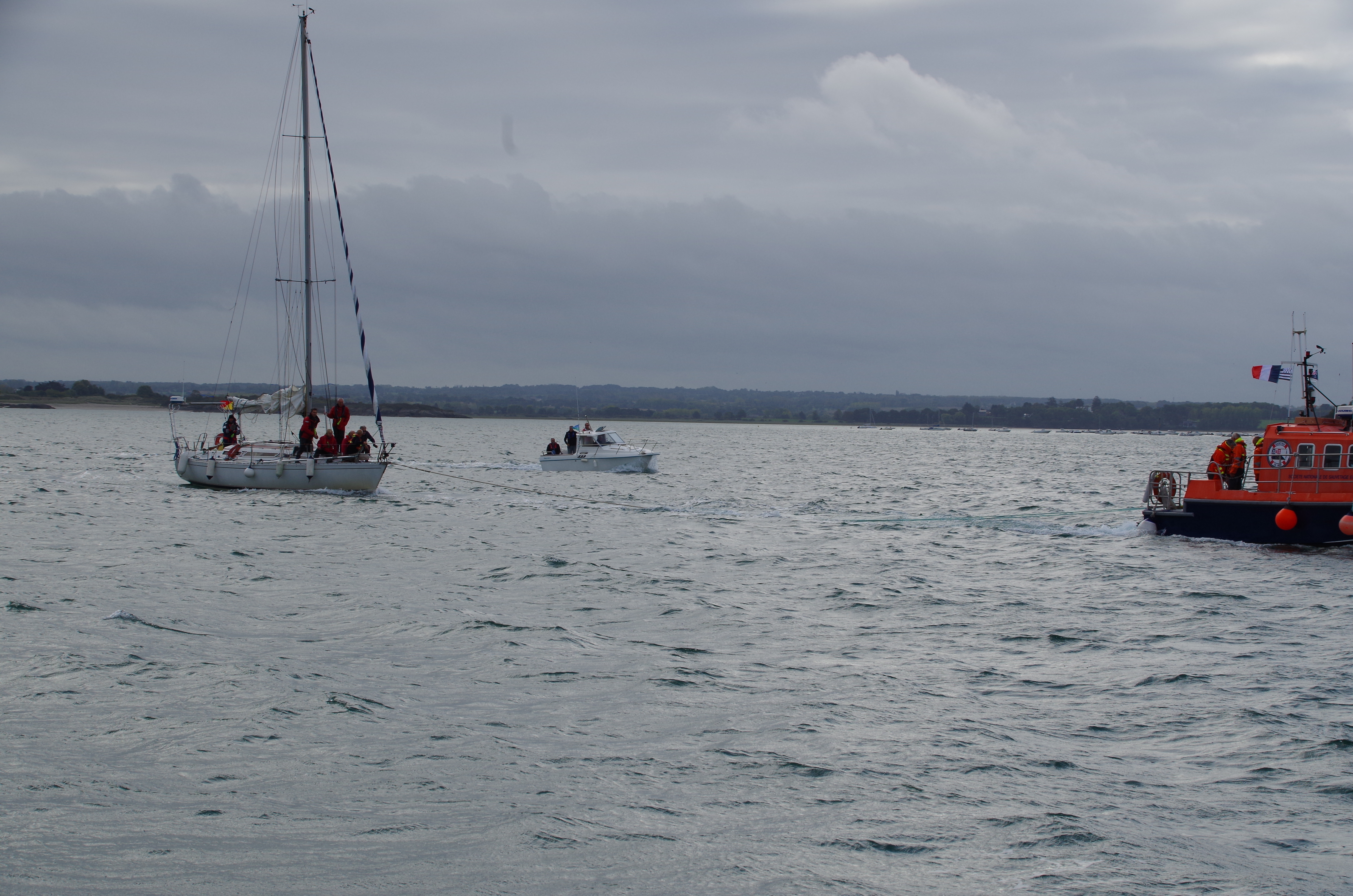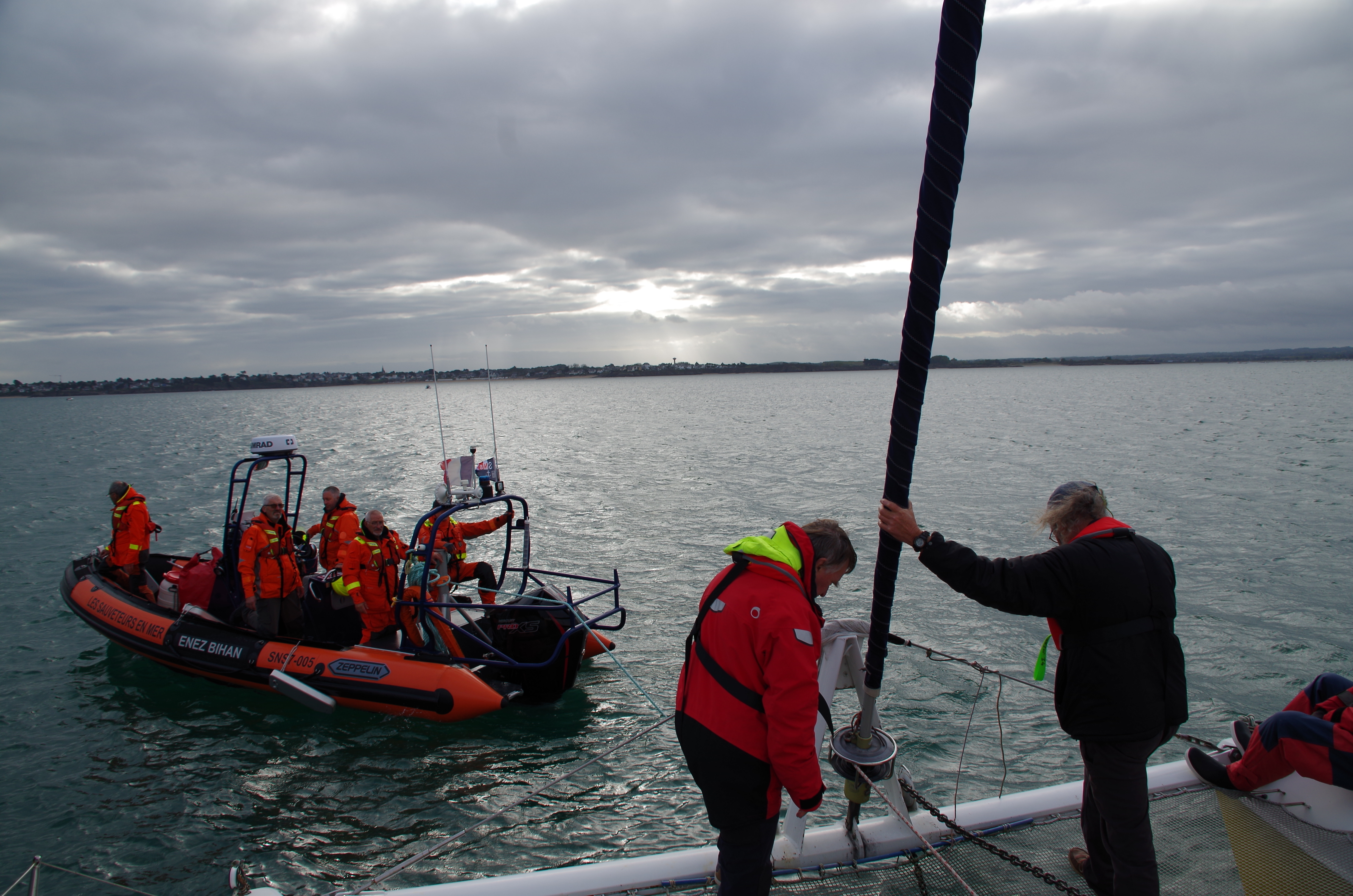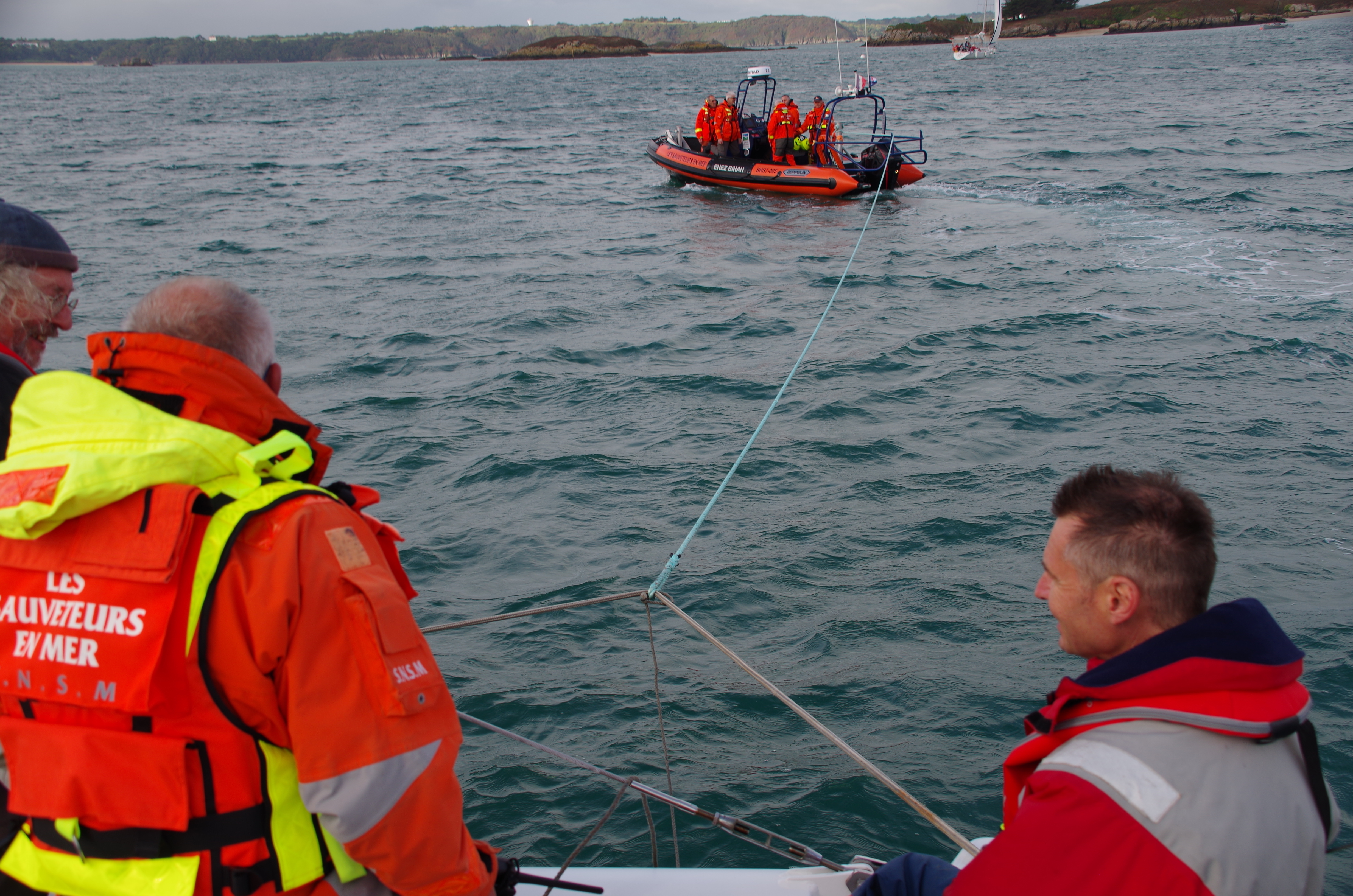 Nous passons ensuite à un exercice de remorquage (déjà initié lors de la manille cargo ). La réglementation impose d’avoir une remorque à bord. Nous l’avons, mais il faut, pour un remorquage efficace la monter sur une patte d’oie. Nous montons le dispositif sur Big-Bang et le semi rigide n’a aucun mal à nous prendre en remorque. Mais un multicoque ne se remorque pas si facilement. Prendre un virage est compliqué. Le bateau ne vire pas comme un mono, il faut faire une grande boucle pour y parvenir sous peine de faire des dégâts. Nous avons en visuel Antécume qui tourne avec beaucoup plus de facilité. Au final cet exercice est bénéfique pour tous, le débriefing de la SNSM sera sûrement constructif. Il est préférable d’aider, si possible le cata à virer.