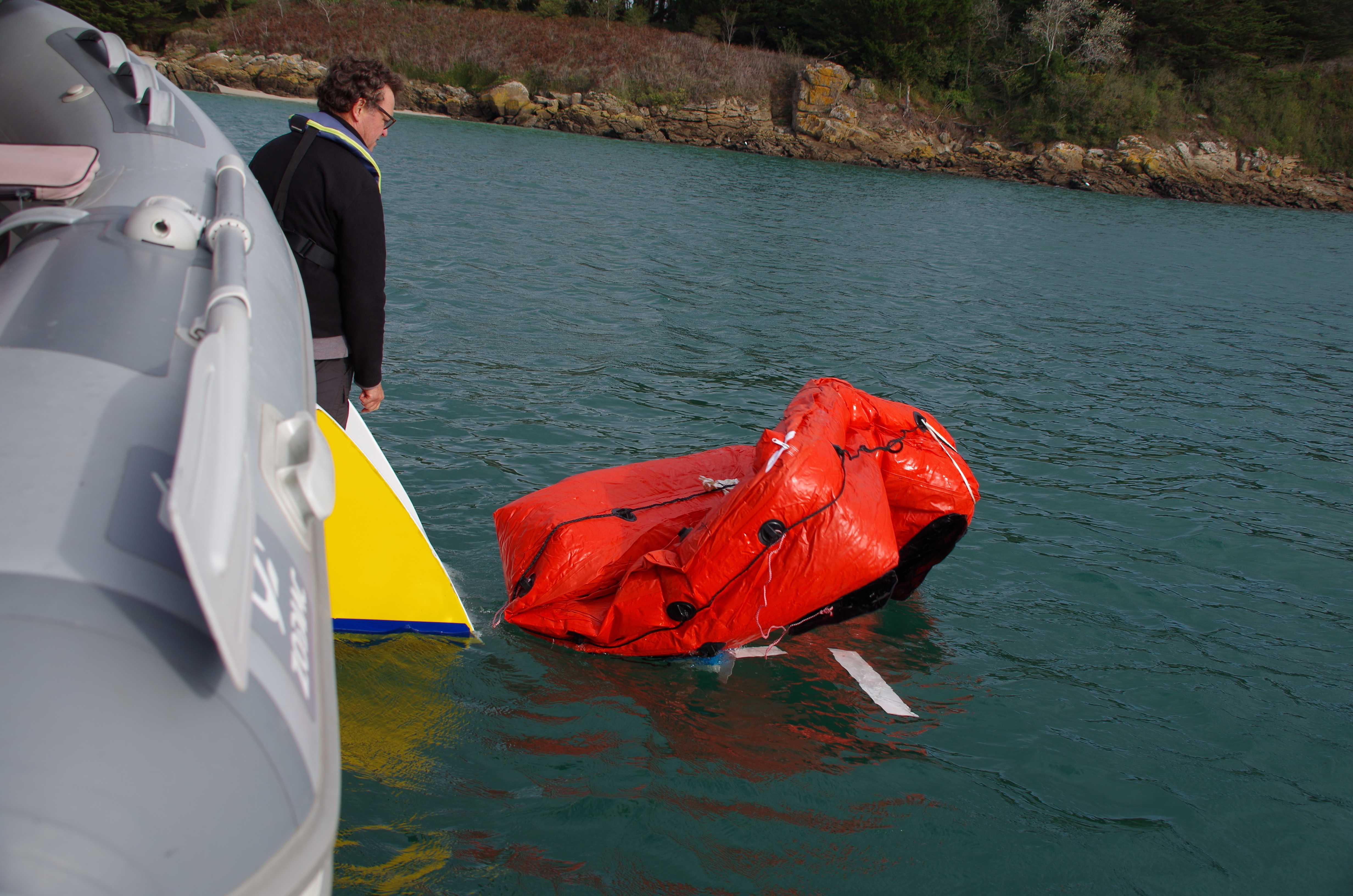 La fin de la cession arrive, il est temps de se mettre au mouillage est de partager le pot de l’amitié très sobre afin de rester efficace. Mais nous en profitons pour percuter une survie et de faire une démonstration de technique de retournement du radeau si d’aventure il se gonflait à l’envers. En maillot de bain dans une eau à 18° ce ne fut pas un problème. Mais il ne faut pas perdre de vu le risque d’hypothermie qui guette un naufragé.
