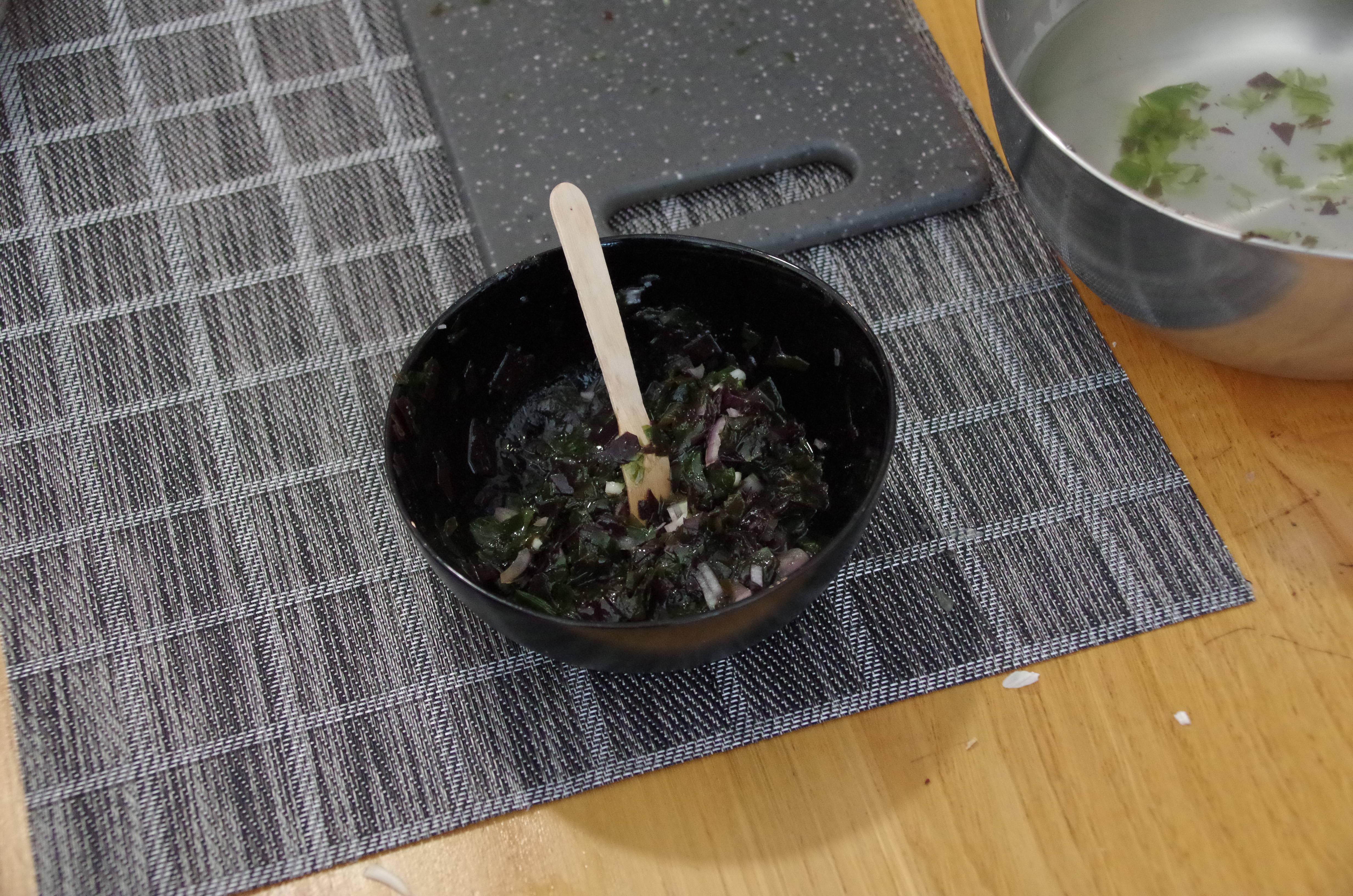 Après notre découverte sur la plage, nous sommes passés à l’atelier culinaire et avec des algues conservées dans le sel. Par groupe de deux nous avons réalisé un tartare d’algues que nous avons dégusté aussitôt fait avec huîtres et un verre de vin blanc.