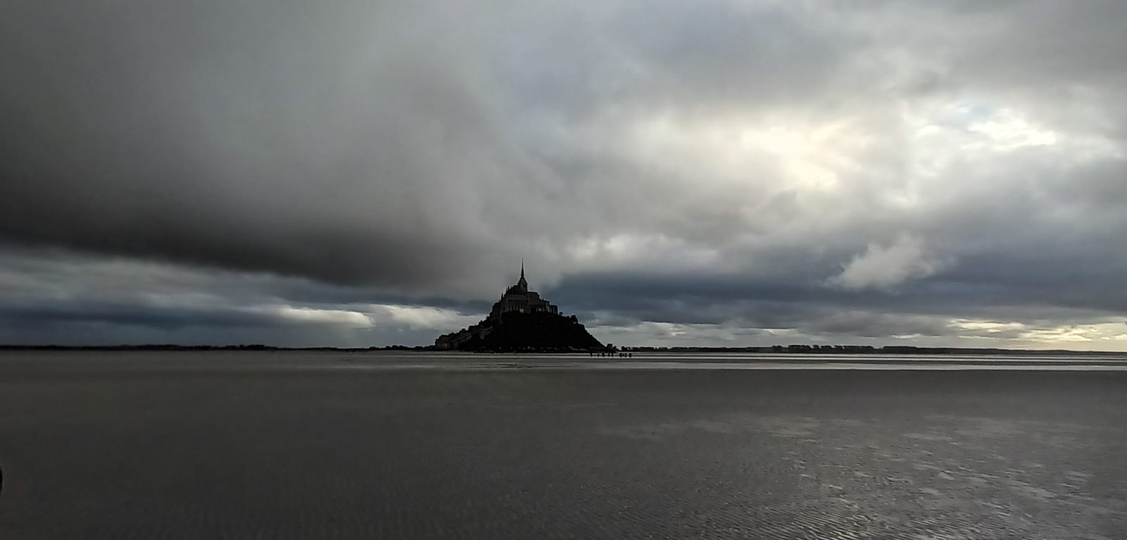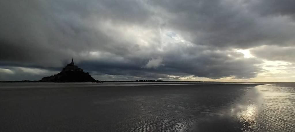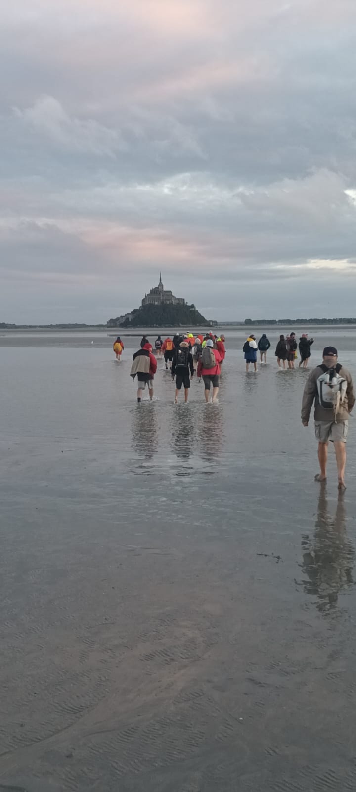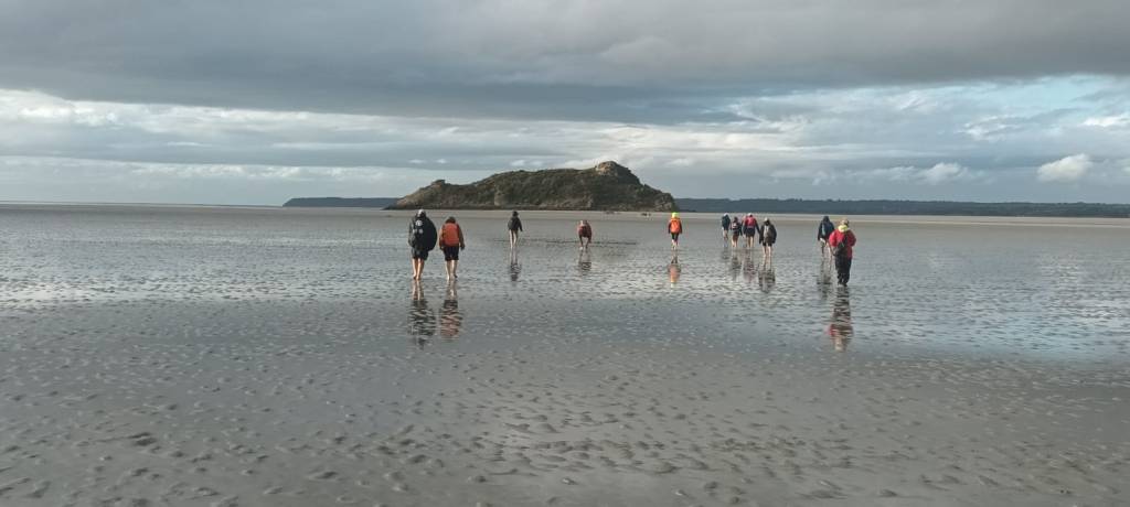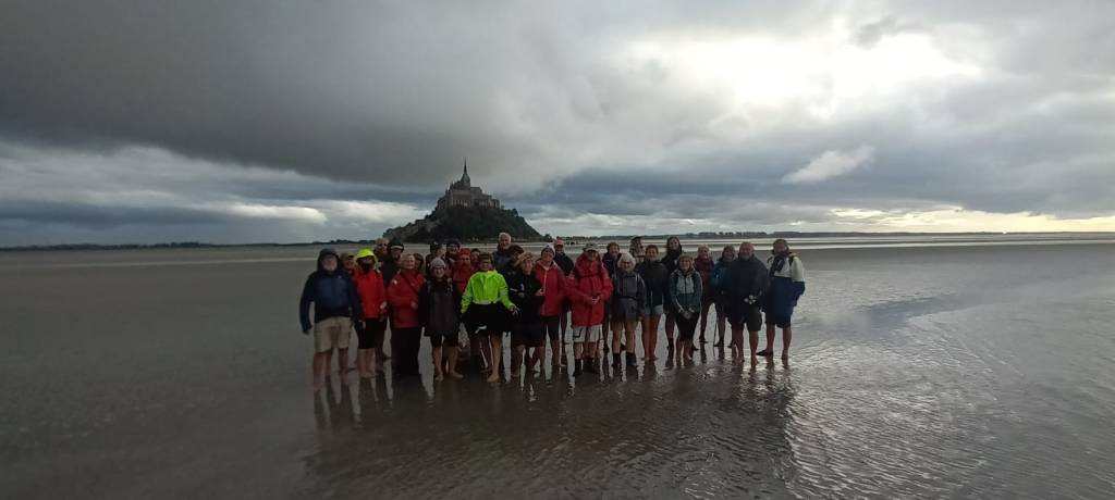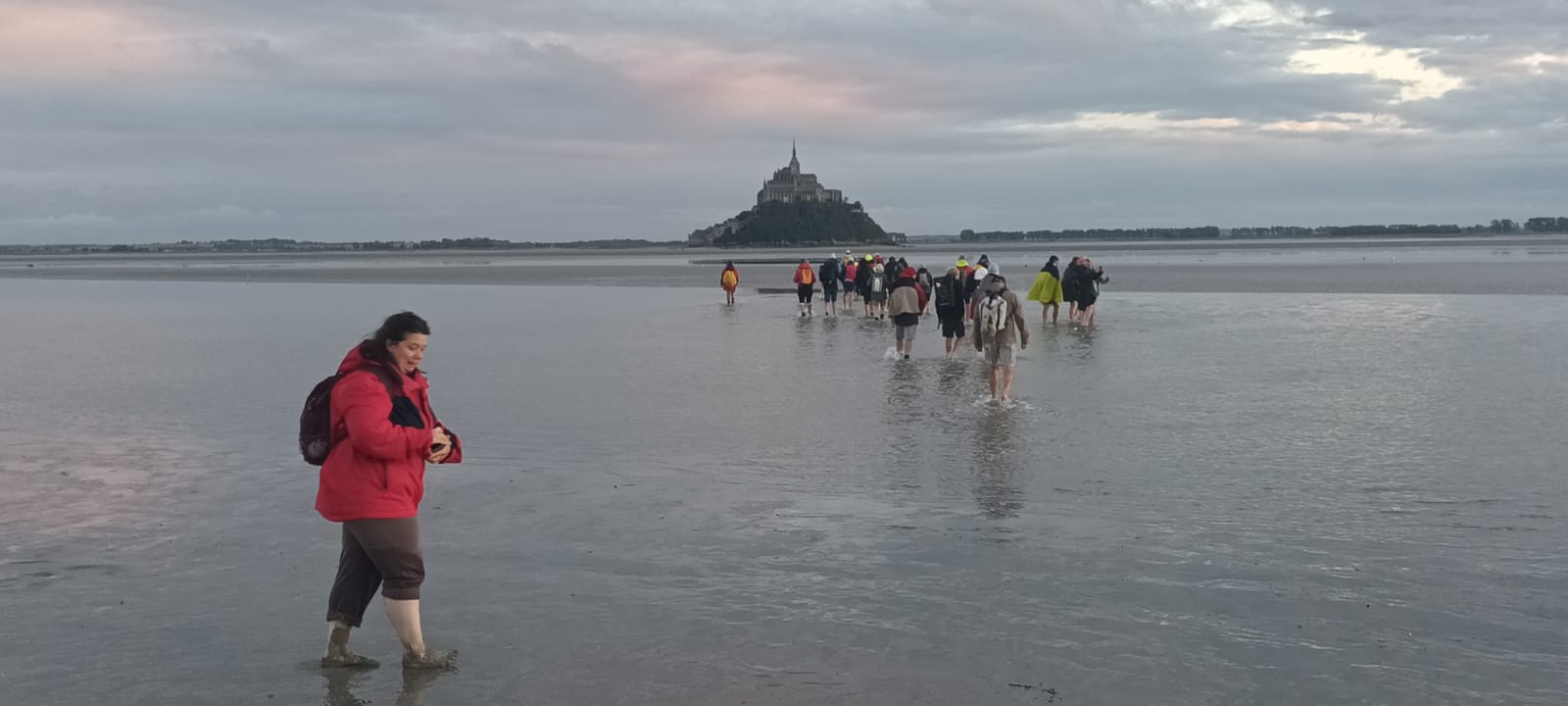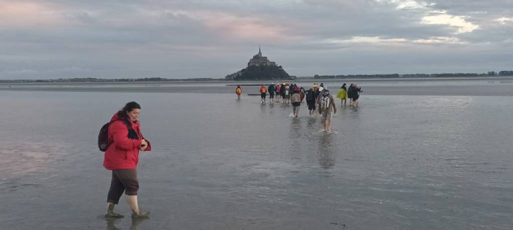 La journée de ce samedi 13 septembre s’annonçait pluvieuse et venteuse pour notre sortie au Mont Saint Michel. Rdv fixé avec notre guide Deborah des Chemins de la Baie devant l’entrée du Mont. Présentations faites, nous nous mettons en marche après quelques conseils et explications de notre guide sur la traversée que nous allons faire. Nous partons sous 1 faible pluie qui ne durera qu’1/4 d’heure puis nous serons préservés pour le reste de la sortie. Deborah prend le temps de nous raconter un peu d’histoire, de nous expliquer la géographie de la baie, ce que l’on peut y trouver comme vie, la faune, la flore…plein d’explications et d’anecdotes enrichissantes qui ponctuent notre marche. Pendant les 2h que dure la traversée vers Tombelaine, les couleurs sur la baie sont magnifiques avec le ciel d’orage sur les terres intérieures qui nous entourent. Nous traversons 2 rivières, le Couesnon et la Selune, non sans avoir expérimenté de façon ludique les sables mouvants. Certains ont été bien téméraires ! Le pique nique sur les rochers au pied de Tombelaine fut le bienvenu, accompagné d’un rayon de soleil et de lumières magnifiques. Au coucher du soleil, retour vers le Mont à la tombée de la nuit. La nuit est douce et le retour nous emerveille. Le Mont s’allume pour le plaisir de nos yeux. On se retrouve à l’entrée du Mont après avoir retraversé la baie et ses rivières. Rinçage des pieds à l’eau douce et retour au parking par la navette. Le temps nous a gâté, de beaux rêves nous attendent…