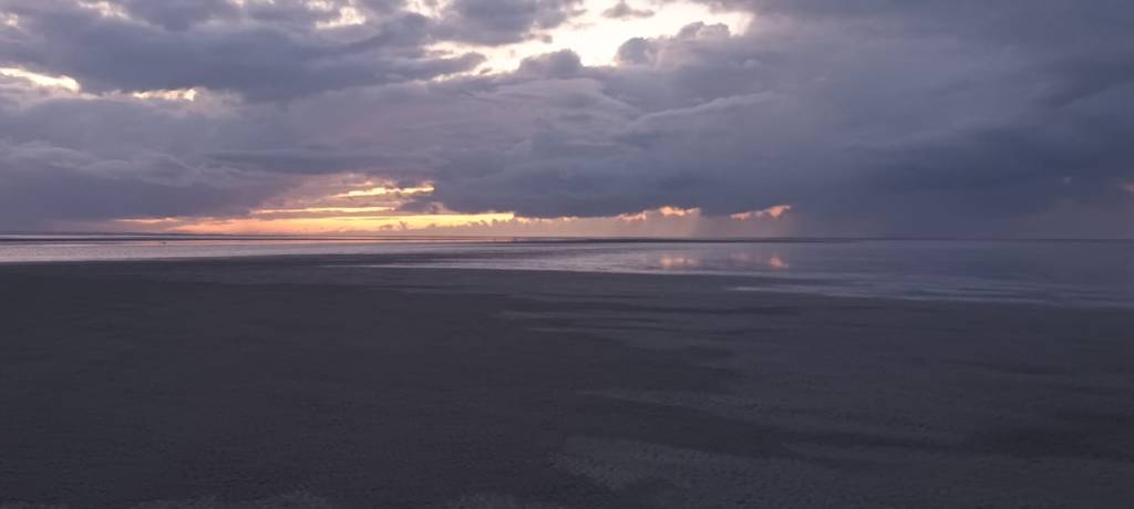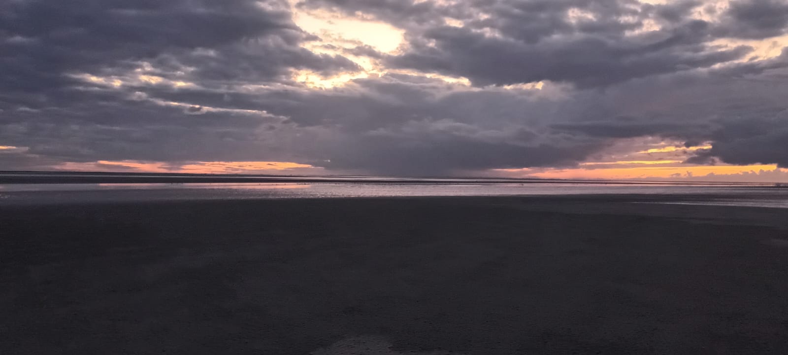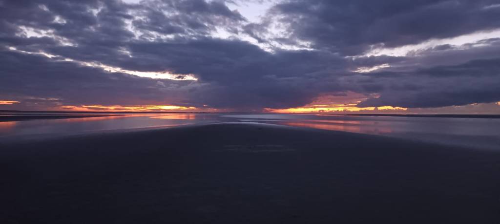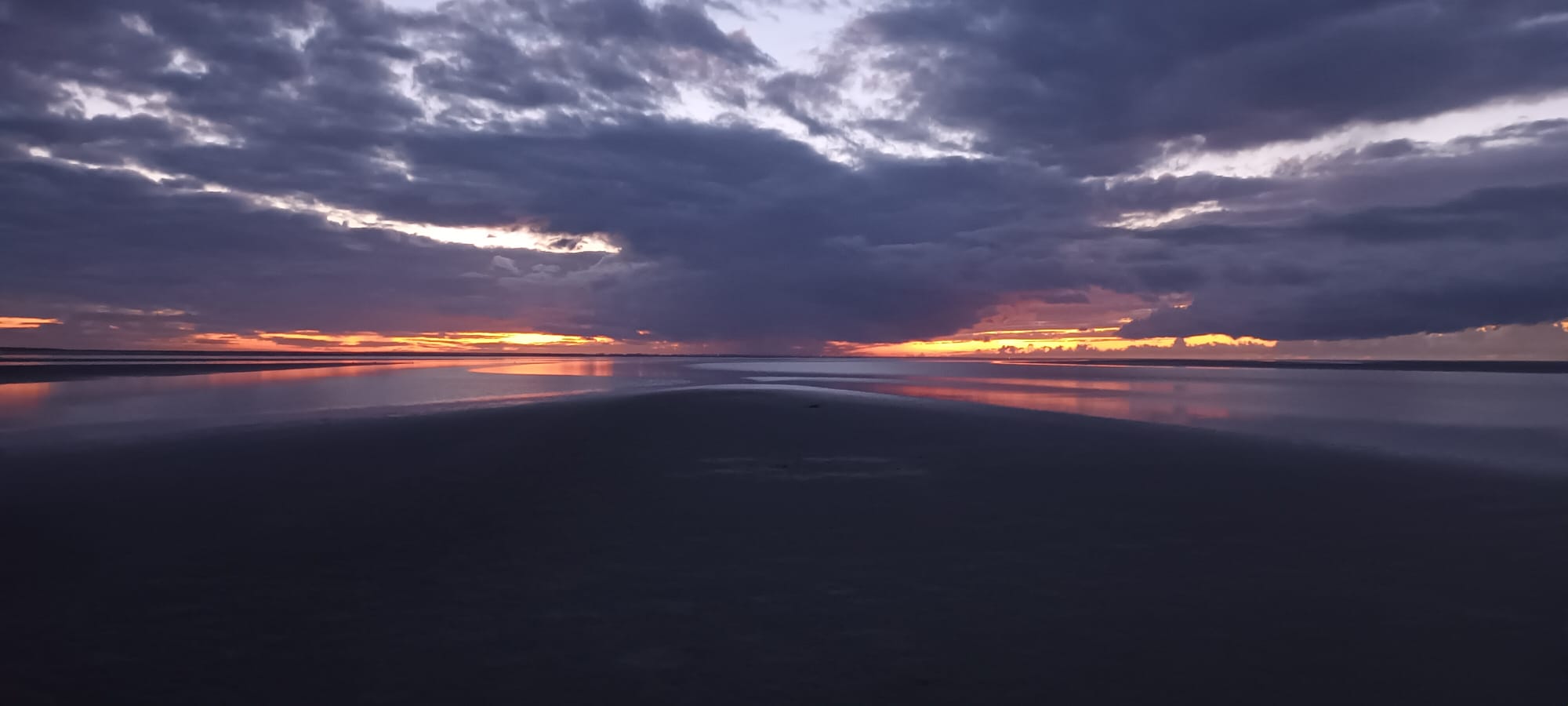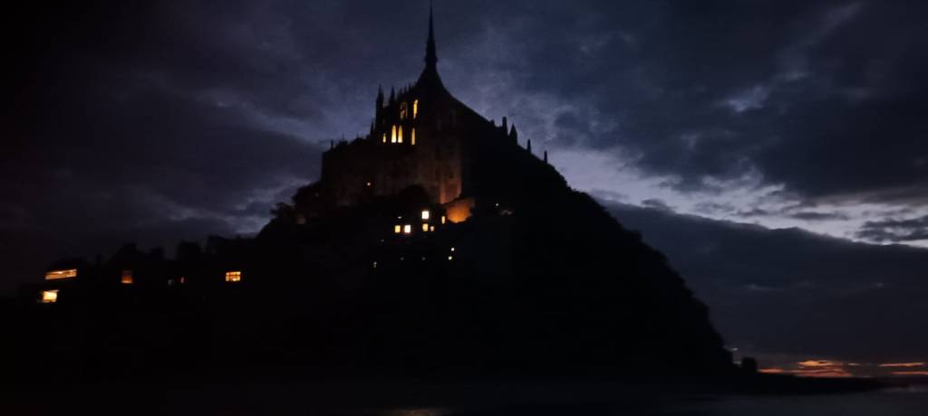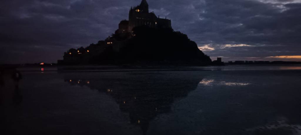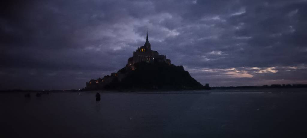 La journée de ce samedi 13 septembre s’annonçait pluvieuse et venteuse pour notre sortie au Mont Saint Michel. Rdv fixé avec notre guide Deborah des Chemins de la Baie devant l’entrée du Mont. Présentations faites, nous nous mettons en marche après quelques conseils et explications de notre guide sur la traversée que nous allons faire. Nous partons sous 1 faible pluie qui ne durera qu’1/4 d’heure puis nous serons préservés pour le reste de la sortie. Deborah prend le temps de nous raconter un peu d’histoire, de nous expliquer la géographie de la baie, ce que l’on peut y trouver comme vie, la faune, la flore…plein d’explications et d’anecdotes enrichissantes qui ponctuent notre marche. Pendant les 2h que dure la traversée vers Tombelaine, les couleurs sur la baie sont magnifiques avec le ciel d’orage sur les terres intérieures qui nous entourent. Nous traversons 2 rivières, le Couesnon et la Selune, non sans avoir expérimenté de façon ludique les sables mouvants. Certains ont été bien téméraires ! Le pique nique sur les rochers au pied de Tombelaine fut le bienvenu, accompagné d’un rayon de soleil et de lumières magnifiques. Au coucher du soleil, retour vers le Mont à la tombée de la nuit. La nuit est douce et le retour nous emerveille. Le Mont s’allume pour le plaisir de nos yeux. On se retrouve à l’entrée du Mont après avoir retraversé la baie et ses rivières. Rinçage des pieds à l’eau douce et retour au parking par la navette. Le temps nous a gâté, de beaux rêves nous attendent…