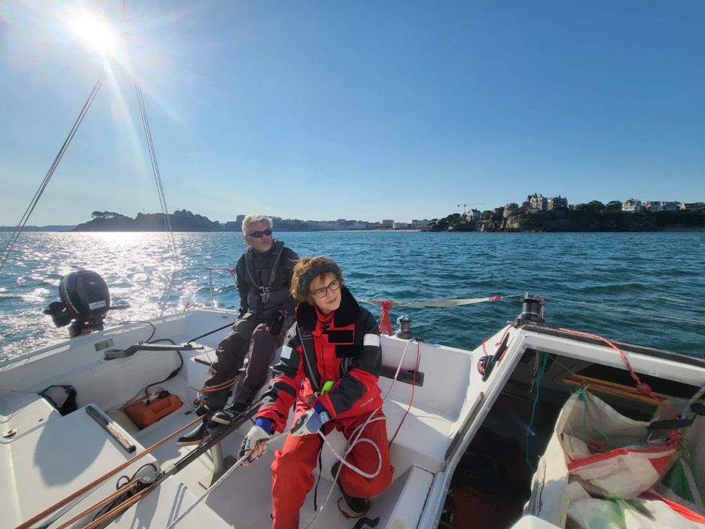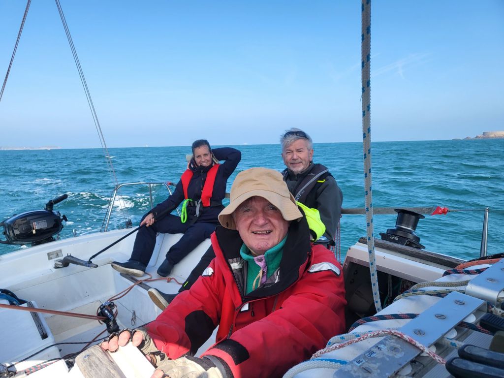 Un bon 20 noeuds d’est arrive et nous oblige à réduire d’un ris (bon exercice d’anticipation) pour rentrer par le Grand Jardin. Descente vers Dinard où nous prenons un mouillage à la voile pour la pause déjeuner.