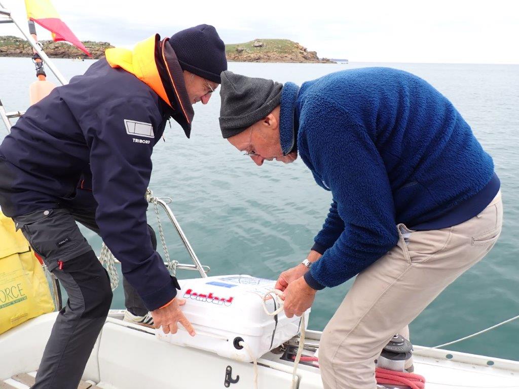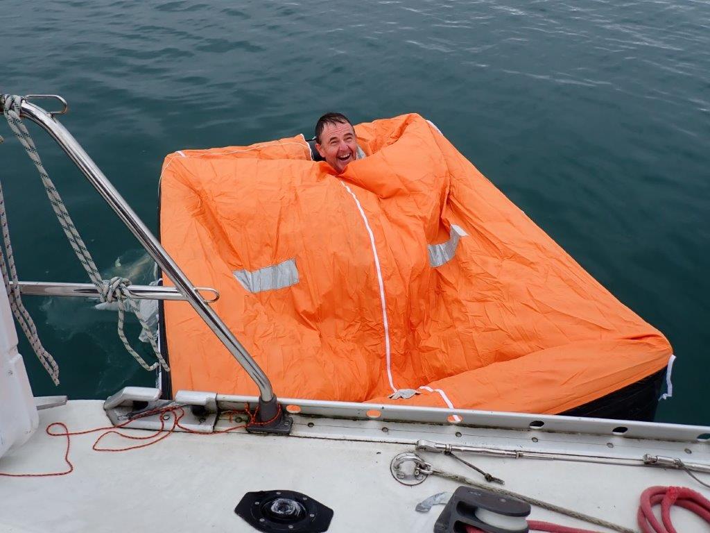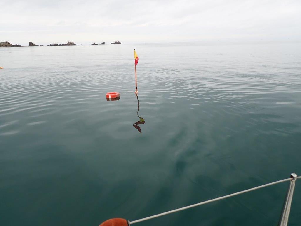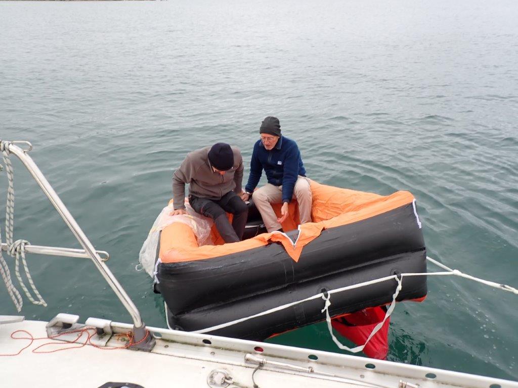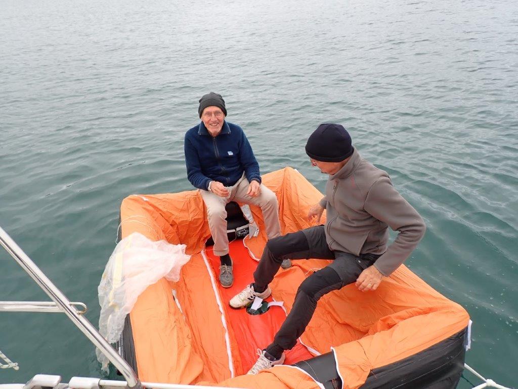 Démarrage dans les brumes, rapidement nous avons mis en pratique les divers éléments de sécurité. A bord , la VHF, la perche IOR puis la pratique des mises à la cap, récupération d’homme à la mer simulée par la bouée puis test du radeau de survie et de sa mise à l’eau. Entre les 2 journées une petite escale pour la soirée à ST CAST.