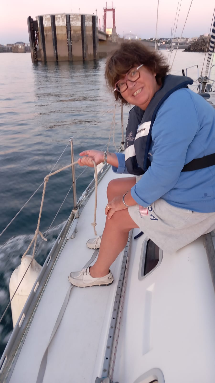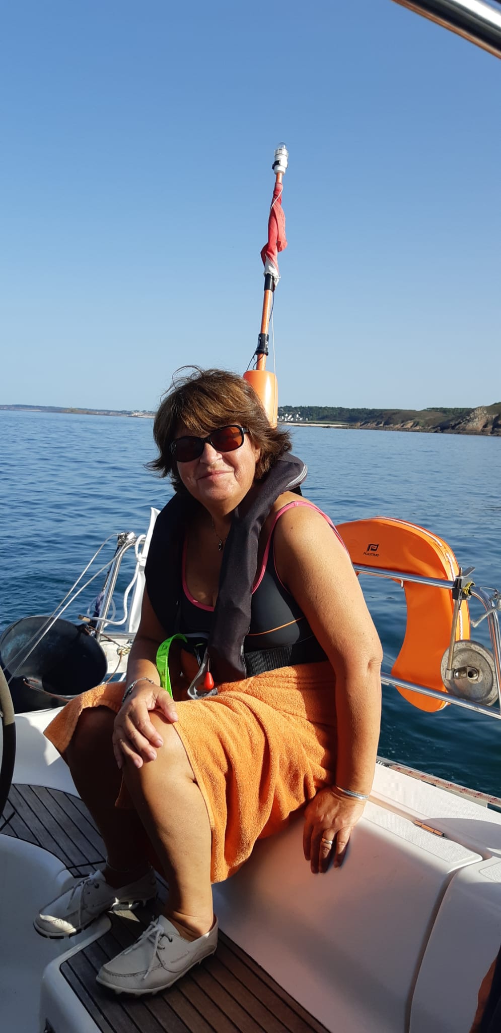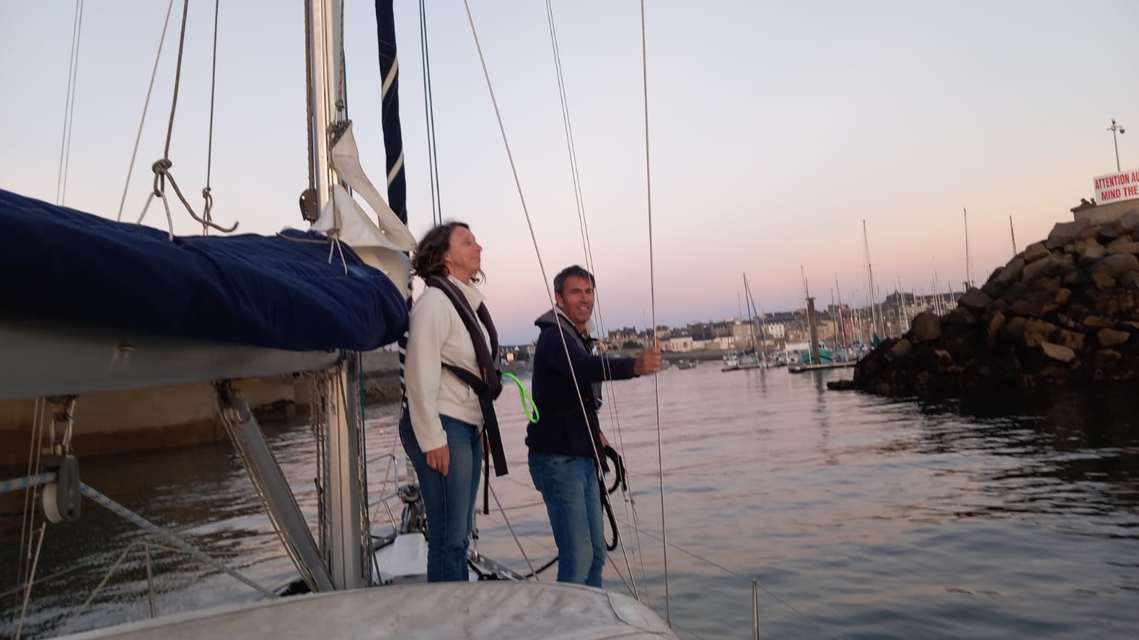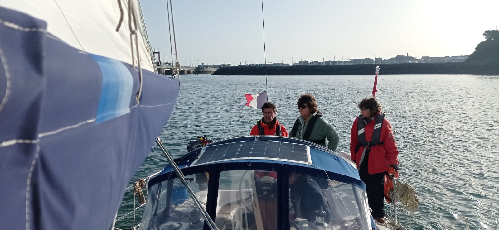 Samedi : alors que l’équipage s’affaire à la prise de son petit déjeuner, le skipper expose les différents éléments de sécurité, emplacements et utilisation, essai des VHF fixe et portable avec le sémaphore de Bréhat, fonctionnement des toilettes (non, c’est pascomme à la maison !). Petite vaisselle terminée, on passe sur le pont : « Non, le grand truc orange n’est pas une canne à pêche ! c’est une perche IOR ! ». Chacun règle à sa taille son gilet de sauvetage et c’est parti !