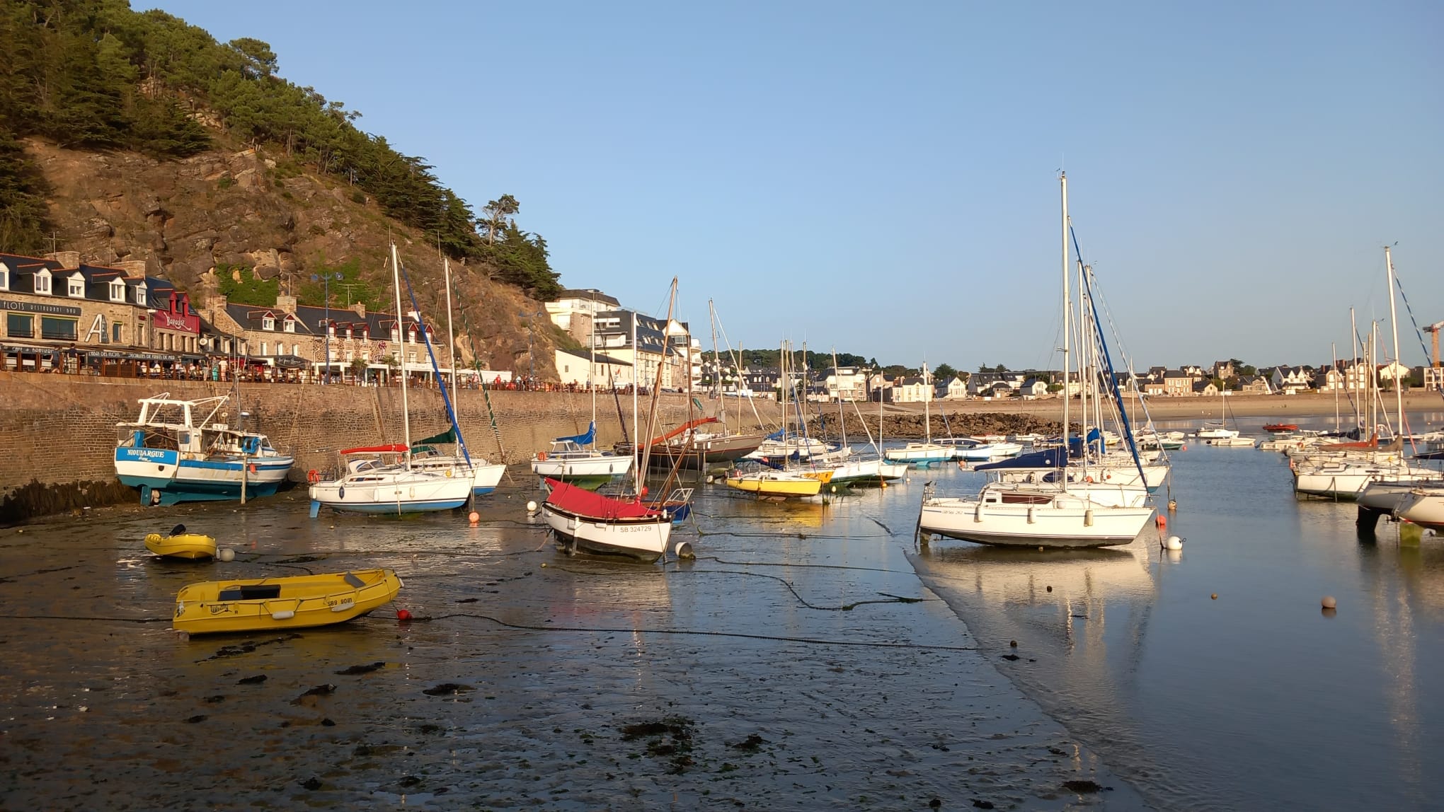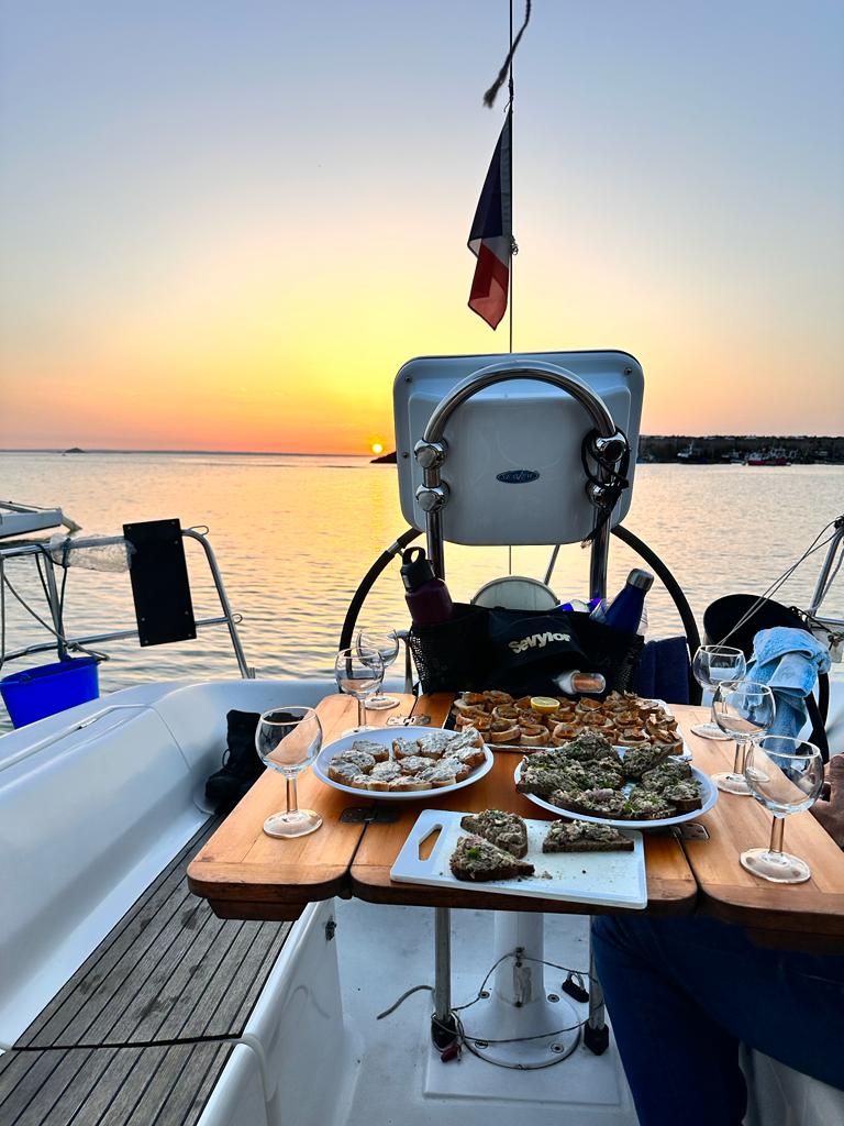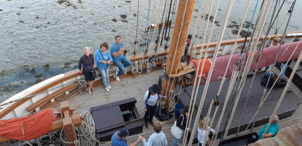 En fin d’après-midi, on arrive à Erquy, on s’amarre à une bouée visiteur, et on profite d’un rafraîchissant bain de mer. Une visite à terre nous conduit à découvrir le Sainte-Jeanne, une réplique d’un sloop bornier de 1912. De retour au bateau, un apéritif est servi devant un magnifique coucher de soleil et un feu d’artifice. On félicite notre skipper Jean Pierre pour cette impeccable organisation et on termine la journée avec un festin préparé par Paulette, comprenant du foie de lotte maison, rougail, et un far en dessert. La nuit tombe paisiblement sur le bateau.