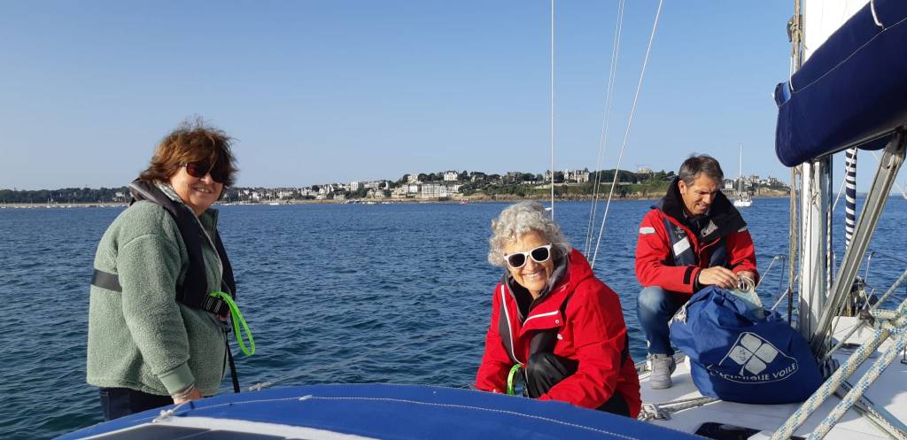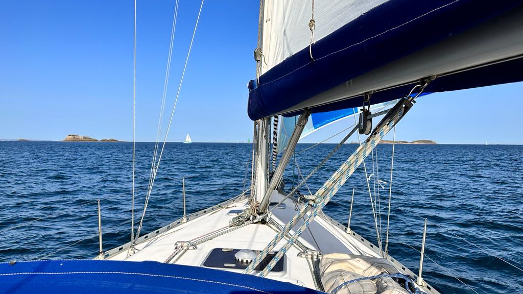 Le samedi matin, deux nouveaux équipiers ont rejoint le bateau : Paulette, venant de Douarnenez avec 3 heures de route, et Patrick, apportant des petits pains et des croissants frais. Malgré les inquiétudes de Jacqueline pour son jardin de légumes, Marie Catherine a réussi à la persuader de rester pour le week-end. Puis Patrick a brièvement présenté le bateau de régate « Surprise » de la NAV, mais la visite a été rapide car il n’y a pas grand chose à voir : l’intérieur est en effet épuré pour gagner en légèreté. Le départ de la croisière a lieu vers 10h, avec pour destination Erquy, sous un ciel azur et une brise légère du sud. Le spi asymétrique est hissé, et Marie Catherine prend la barre en laissant la cardinal Le Sou à Babord et le Grand jardin à Tribord.