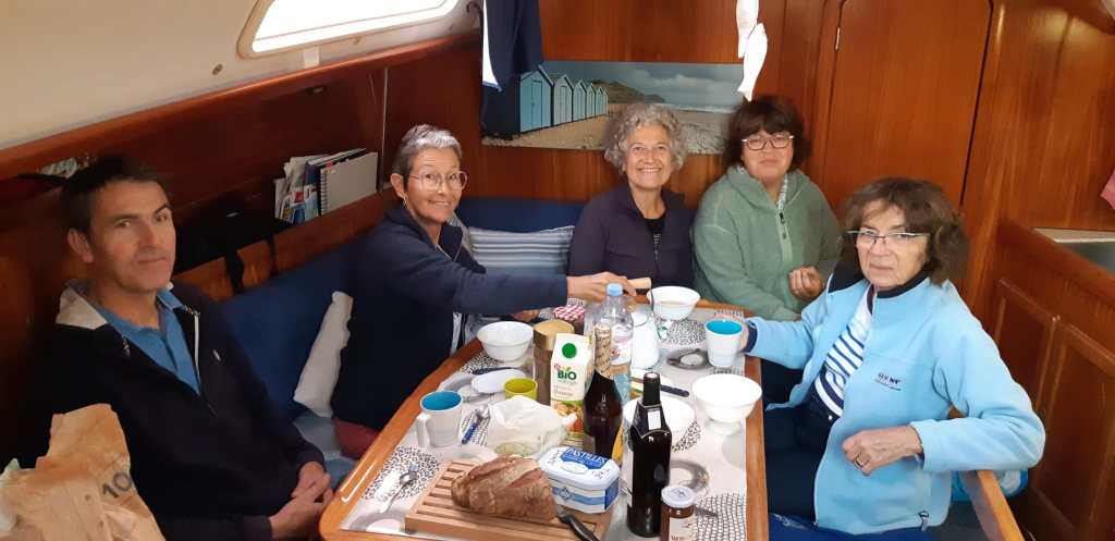 le week end débute par un rendez-vous au port des Bas Sablons le vendredi soir. Les équipières, Elisabeth, Christine et Marie Catherine, ont fait route ensemble depuis Rennes pour rejoindre Jean Pierre, le skipper, et son épouse Jacqueline. La soirée a été marquée par un délicieux repas grec préparé par Christine, avec une salade grecque, tzatziki, pita, yaourt grec, miel et noix.