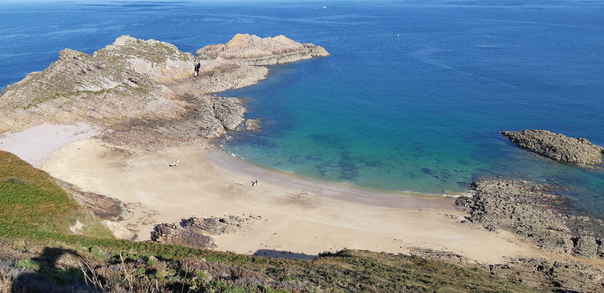 Le dimanche matin s’annonce radieux, et nous savourons un petit-déjeuner agrémenté des délicieuses confitures de Paulette. Ensuite, nous nous lançons dans une randonnée côtière qui nous conduit au « Lac Bleu » et à une fabrique de boulets de canon. Plus loin, depuis le sommet du cap d’Erquy, une vue spectaculaire s’ouvre sur le cap Fréhel.